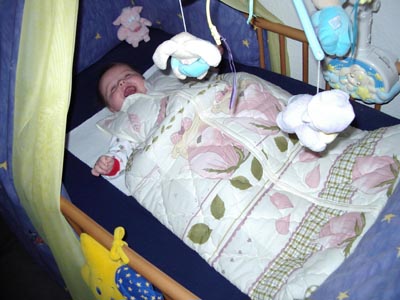 ![]() Da Du immer mehr am Strampeln bist und morgens manchmal quer im Bett liegst, darfst Du ab jetzt im Schlafsack schlafen, den Dir Theos Mama, Omi Doris, geschenkt hat.