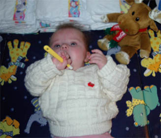 ![]() Seit heute werden jeden Abend schön Zähne geputzt. Schließlich hast Du schon zwei. Und wir möchten auf jeden Fall, dass Du später mal gaaaanz schöne Zähne hast!!! :-) Zuerst warst Du irritiert, was ich wohl mit diesem komischen Ding da in Deinem Mund will. Aber dann hast Du es fast genossen, das Zahnfleisch massiert und die Zähnchen saubergemacht zu bekommen. Die "Borsten" sind übrigens aus gummi-ähnlichem Material und auf Wasser oder gar Zahnpasta können wir noch verzichten.