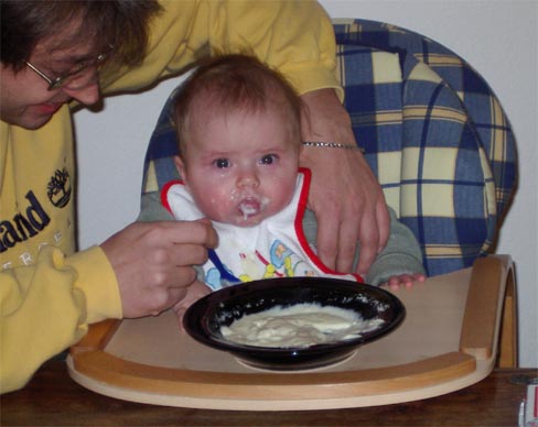 Erweist sich allerdings als noch nicht so praktisch, da ich Dich mit einer Hand noch halten muss. Die andere Hand brauche ich eigentlich, um Deine H鋘de vom Teller fernzuhalten (sonst k鰊nten wir gleich neu tapezieren), oder Dir den Brei aus den Haaren zu friemeln. Fehlt also eine zum F黷tern. ;-) Vorerst belassen wir das F黷tern lieber noch im Wipper!