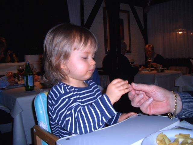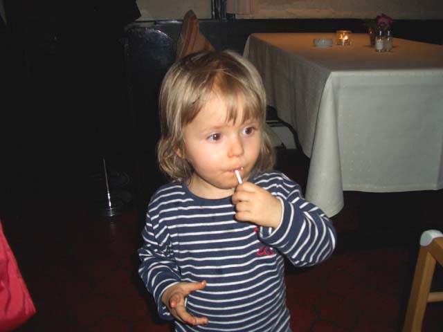 Abends sind wir dann ins Venezia essen gegangen. Das Restaurant gehörte früher Deinem Großopa Vittorio und jetzt ist Rolando, sein Cousin, der Besitzer. Eifrig hast Du Pommes frites und auch Fleisch gegessen. Hinterher brachte Dir Linda, die Bedienung, noch ein kleines Eis und von Rolando hast Du einen Lutscher bekommen. Der war Dir ziemlich neu, denn Du hast ihn zuerst mit dem Stiel in den Mund gesteckt. Aber schnell hattest Du raus, dass das andere Ende besser schmeckt. Hinterher warst Du von oben bis unten verklebt! Du wurdest auch recht bald müde und quengelig, denn Du hast heute nicht viel geschlafen. Omi Silvana