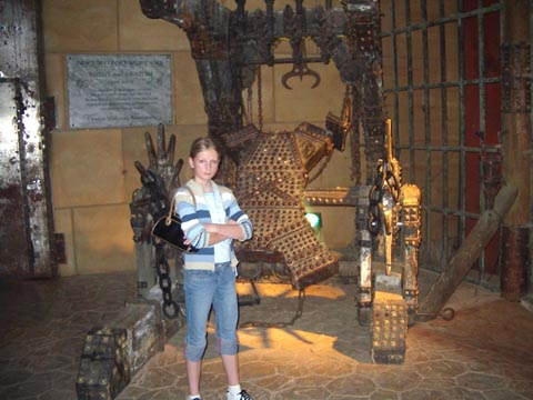 Lisa vor einer gruseligen, römischen Foltermaschine.