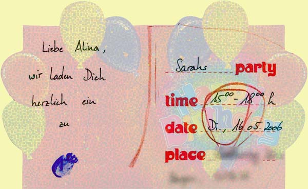 Nach dem Kindergarten bist Du heute zum Geburtstag eingeladen - bei Sarah. Eigentlich die erste richitge Party, auf die Du eingeladen bist. :-) Leider keine Fotos, aber ein paar Worte dazu gibt´s im Link.