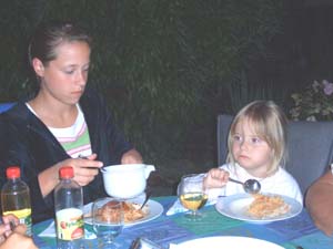 Mama und Papa sind nach dem Abendessen ins Kino und wir warteten auf den angekündigten Besuch, der im Stau stand. Gegen 21.00 Uhr kam er dann endlich: Opi Theo's Nichte Tine, ihr Mann, die Tochter Zyna sowie ihre Freundin. Sie waren auf der Urlaubs-Rückreise mit dem Wohnmobil und haben bei uns einen Zwischenstop eingelegt. Ich habe dann für alle Spagetti gekocht und Du wolltest auch noch einmal mit essen.