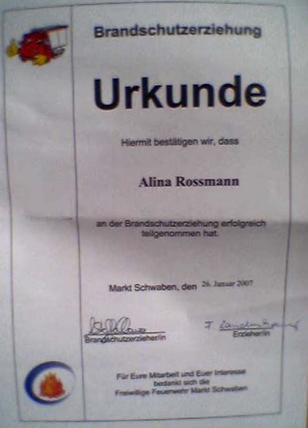 Heute war die Feuerwehr bei Euch im KiGa. Zum Glück nur zum Üben. Und zwar mit Euch Kleinen. Dass Feuer was Gefährliches ist, und was man tun muss, wenn es brennt (die Telefonnummer 112, das wußtest Du noch ein paar Tage später). Nach der Teilnahme an der "Brandschutzerziehung" hat jeder von Euch eine Urkunde bekommen. Nach dem KiGa warst Du dann bei Emily. Siehe Link für ein (schlechtes) Foto der Urkunde