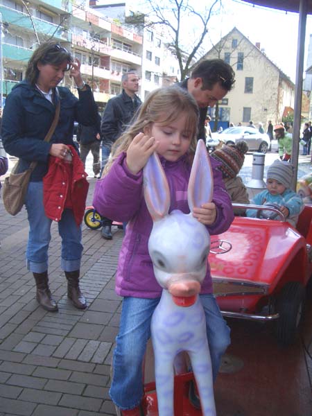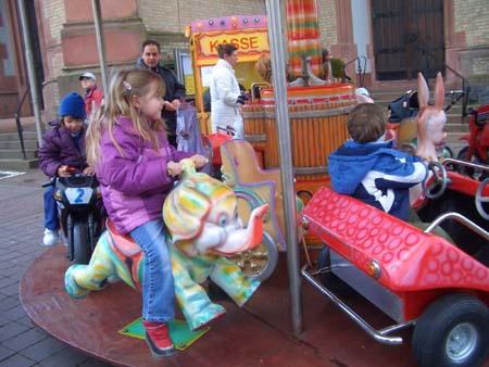 Nachdem wir das Gepäck ausgeladen haben, sind wir gleich in die Stadt, denn da ist heute verkaufsoffener Sonntag. Und da ist auch für Kinder etwas geboten. So gab es da ein Karussell.