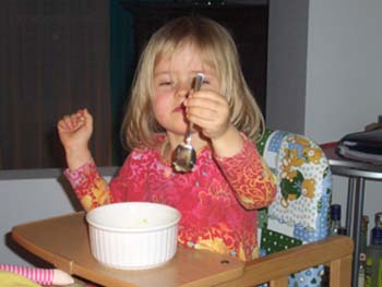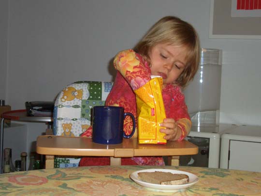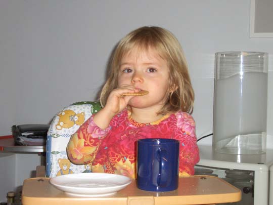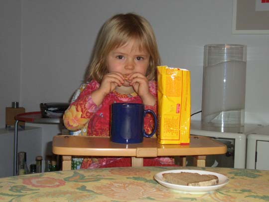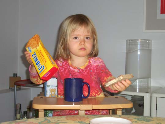 | DI, 23.11.2004: Lecker Butterkekse! Gegen 8.30 Uhr bist Du wach geworden und wir wollten zusammen frühstücken. auch heute habe ich es mit einer trockenen Scheibe Brot probiert. Aber das wolltest Du auch heute nicht. Daraufhin habe ich Dir Butterkekse gegeben.