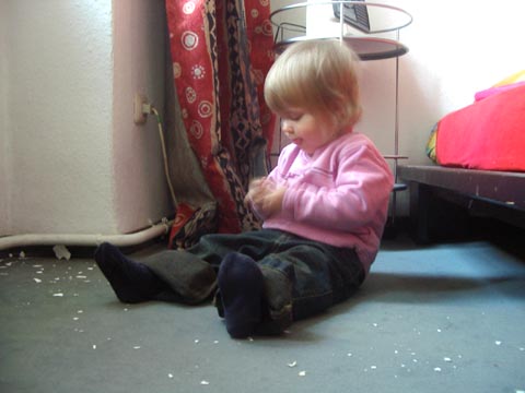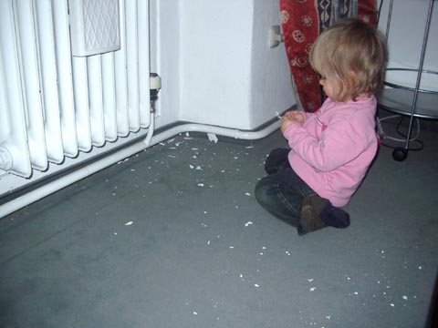 Die hast Du heute Morgen abgepopelt - und ich hab´s nicht mitgekriegt. Völlig in Gedanken versunken saßt Du da in aller Friedlichkeit und spieltest mit den Farbsplittern. Natürlich hast Du die auch in den Mund genommen.