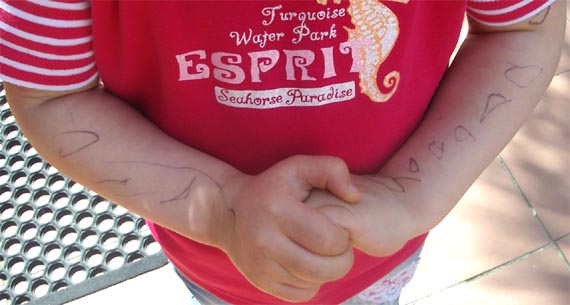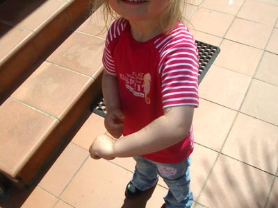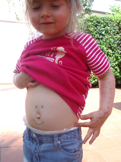 MO, 30.05.2005: Von Papa![]() Das ist heute Morgen. Da hast Du Deine Arme angemalt. ![]() Den Bauch hab´ ich dann verziert. ![]() ![]() Nonno erzählt vom Krieg, Nonna von ihren Schmerzen (das ist kein Witz). Nonna hat Dir ein Püppchen geschenkt, ein Mädchen, das einen Zopf wie Du hat. Deswegen sage ich „die kleine Alina“ zu ihr. Eine Handtasche hast Du auch noch bekommen. Später sind wir einkaufen bei Penny in Viareggio. Nach dem Einkauf kommt Nonna zu uns. Als sie geht, gibst Du ihr selbständig ein Küsschen. Heute hast Du gar kein A-A gemacht, also auch kein Dünnpfiff. Das Wetter war bewölkt heute, windig und relativ kalt, ein paar Regentropfen gab es auch. Abendessen: Nudeln ohne Tomatensoße und etwas Kuchen. Um 20.15 h bist Du völlig problemlos ins Bett. Dann Weinen um 1.20 Uhr: DOCH noch Dünnpfiff. Arme Maus!!! |
